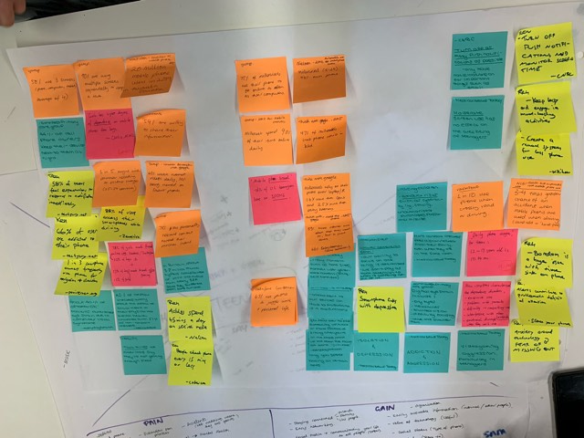 Next we thought of the many reasons that people stare at their phones. First by writing down subheadings then, elaborating more with specifics. Next was to really look a the problem and actually define it.